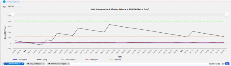 Additionally, daily forecasting for each grade, at each discharge port, is provided using time series forecasts. The ideal number of vessels of mixed sizes used for time charter for maximum utilization can be identified. This also ensures compliance with restrictions such as Draft, Air draft, LOA, Beam, Vessel age, Vessel flag, Drydocking, and so on. It also gives planners the ability to plan revised schedules that factor in disruptions reported by the vessel or at the port – a major cost-saving feature. The schedule can easily be adjusted to handle disruptions that are required to satisfy demands.