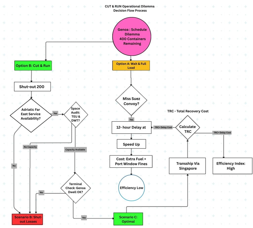 Liner services operate on strict “windows” to ensure port productivity and canal transit synchronization. When a vessel falls behind schedule at a key hub like Genoa, the delay cascades through the entire rotation. The primary conflict is between Cargo Integrity (loading all planned units) and Schedule Integrity (maintaining the Suez convoy window).