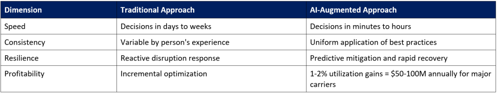 Crucially, these benefits compound. Small percentage improvements in utilization, fuel efficiency, or container balance translate into significant financial impact at global scale advantages that widen over time as AI systems learn and improve.