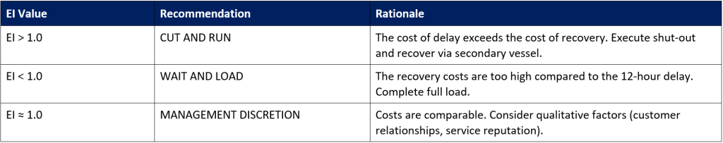 The system should trigger a “Cut and Run with Recovery” (Scenario C) only if TRC is less than the Delay Impact Cost (DIC) the cost of 12 hours of vessel hire plus late fines at subsequent ports.
