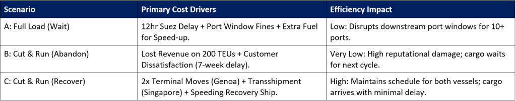 This scenario explores a “Cut and Run” maneuver, where a vessel departs under-loaded to avoid a 12-hour bottleneck at the Suez Canal. The decision-making process must evaluate the feasibility of “Recovery Services” using secondary vessels to pick up abandoned cargo while accounting for transshipment costs at downstream hubs like Singapore.